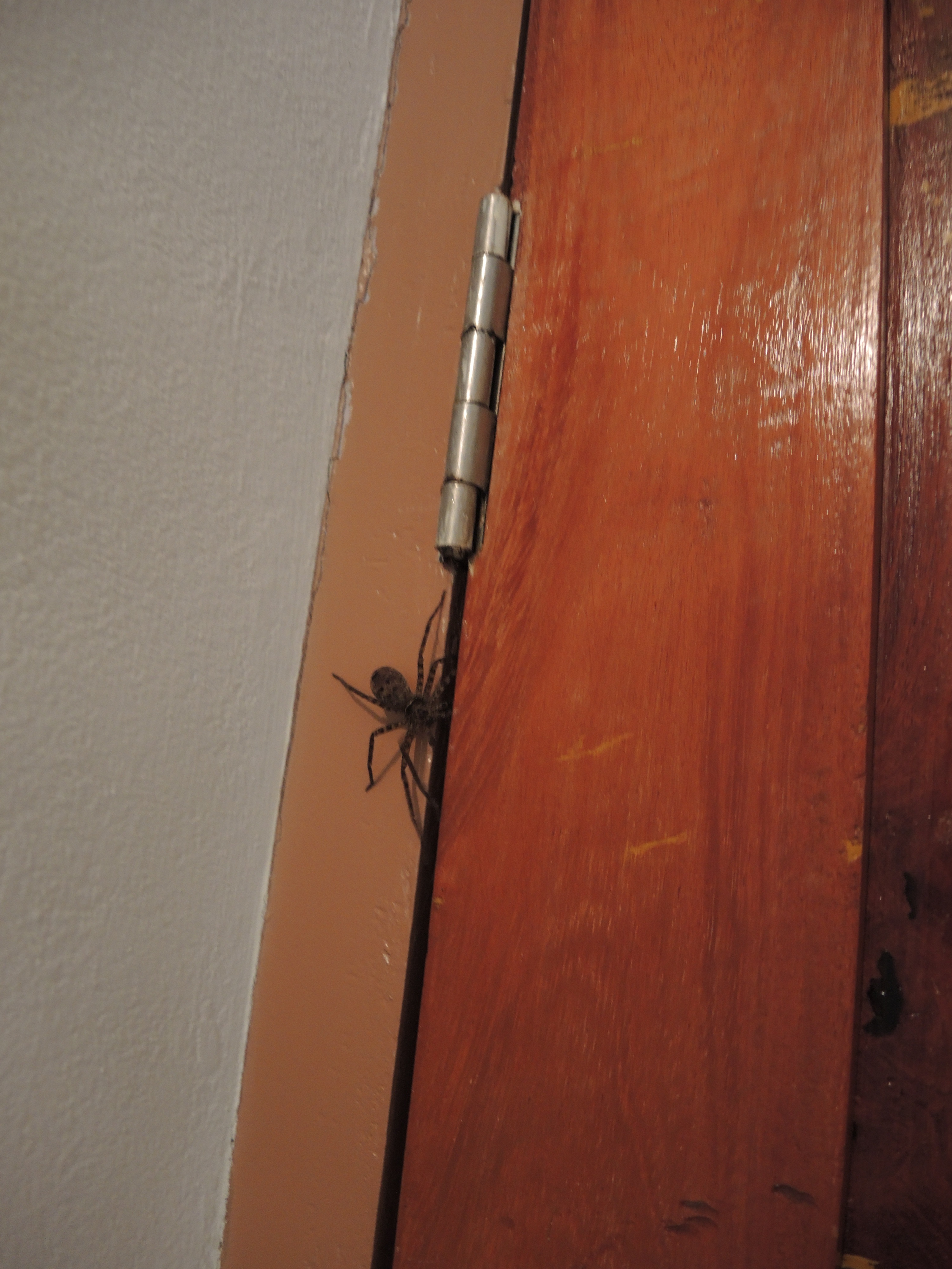 This spider greeted me Monday morning in my room at the convent in Kottagiri. Please note the door hinge for scale.